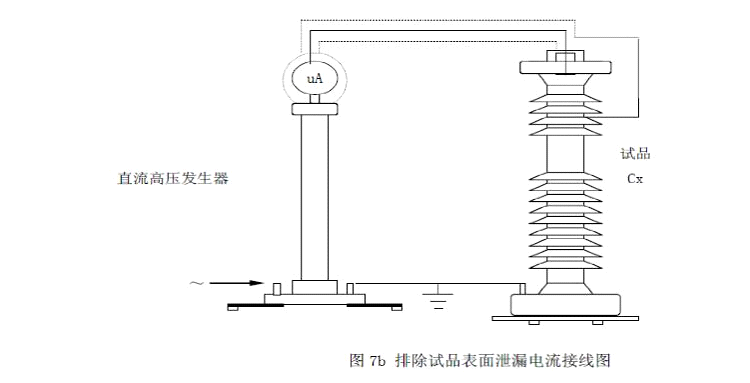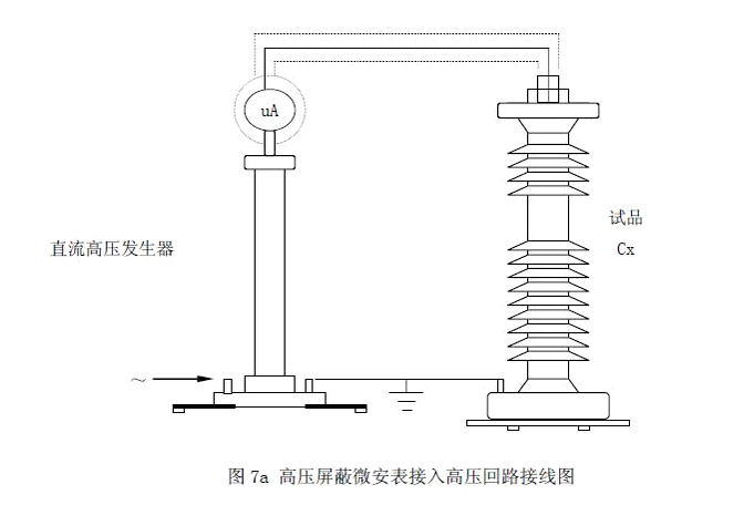 图7a 高压屏蔽微安表接入试品Cx高压侧接线图。高压屏蔽微安表必须有金属屏蔽,应采用屏蔽线与试品联接,高压引线的屏蔽引出应与仪表端的屏蔽紧密联接。如果要排除试品表面泄漏电流的影响,可在试品高电位端用裸金属软线紧密绕几圈后与高压引线的屏蔽相联接(见图7b)。